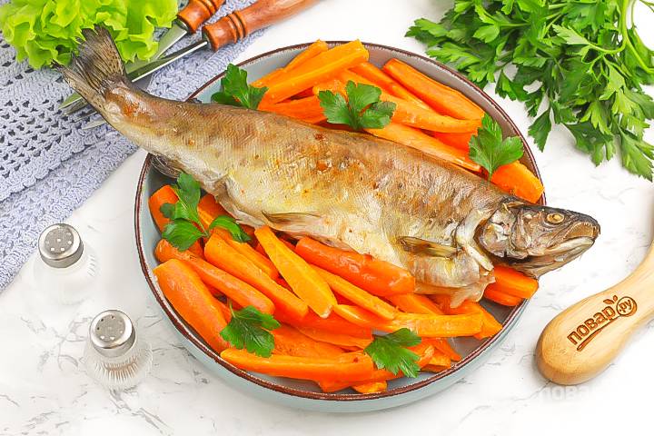 Красочное блюдо, которое можно подать и в обед и на ужин — это форель с морковью. Овощ отлично пропитывается рыбным жиром, становится сочным и румяным при запекании. Добавляйте различные пряности.