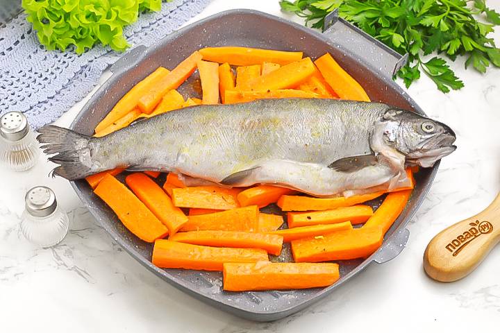 Форель натрите приправой внутри и снаружи, полейте растительным маслом и выложите сверху на морковь. Разогрейте духовку до 200 градусов.