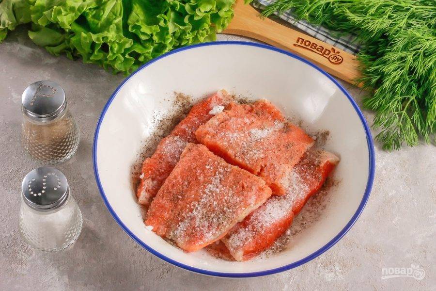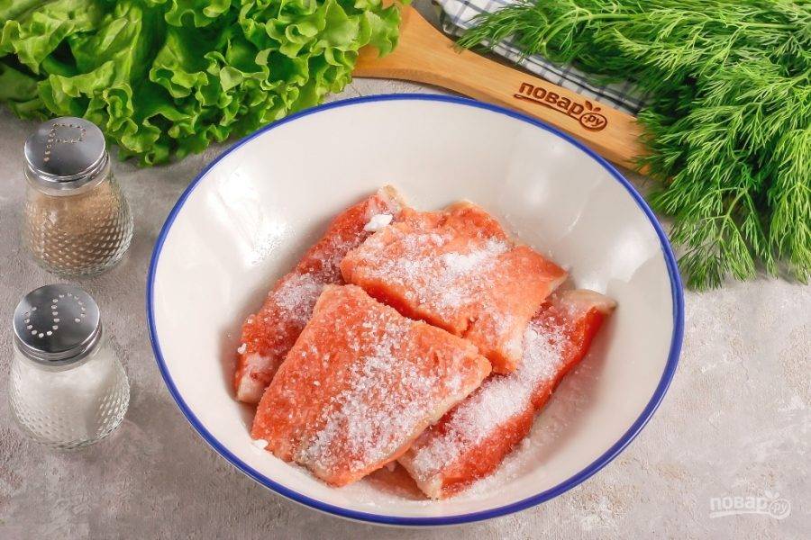 Выложите кусочки форели в глубокую емкость, всыпьте соль и сахар. Тщательно обпанируйте каждый кусочек, чтобы он оказался покрыт смесью. Соль вытянет из кусочков рыбы лишнюю влагу, а сахар придает мякоти легкую сладковатость.