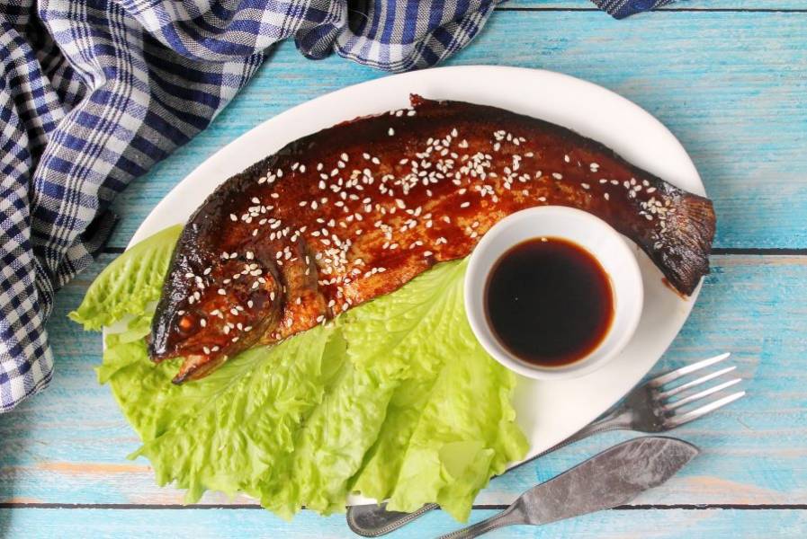 Поставьте форму с форелью в соусе терияки в горячую духовку и запекайте в течение 30 минут при температуре 180 градусов, до готовности. Достаньте форель из духовки, смажьте загустевшим соусом, посыпьте кунжутом и подавайте к столу.