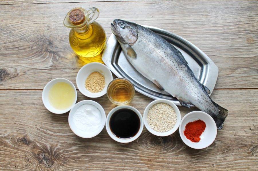 Подготовьте все необходимые ингредиенты для приготовления форели в соусе терияки.