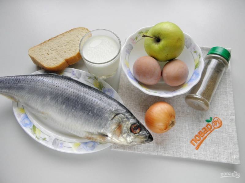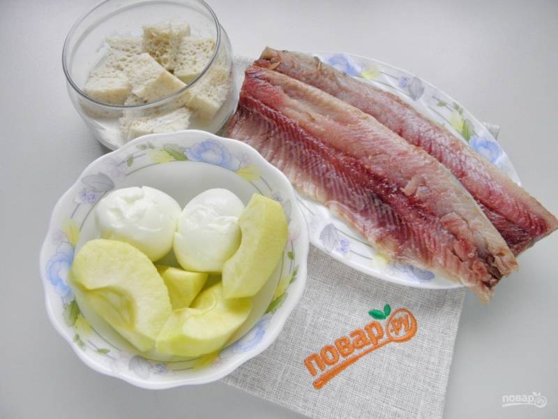 Разделайте селедку на филе, удалите внутренности, голову, кости и кожу. С хлеба срежьте корочки и замочите его в молоке. Яблоко вымойте, снимите кожуру и удалите сердцевину. Перекрутите все продукты два раза через мясорубку. Исключение: один желток, он понадобится для украшения блюда.