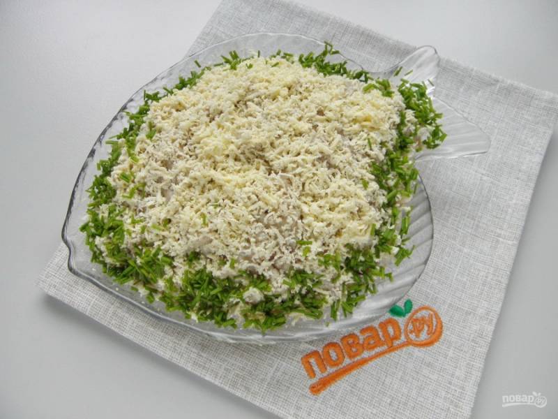 Украсьте тертым желтком и рубленным луком. Подавайте закуску охлажденной. Приятного!