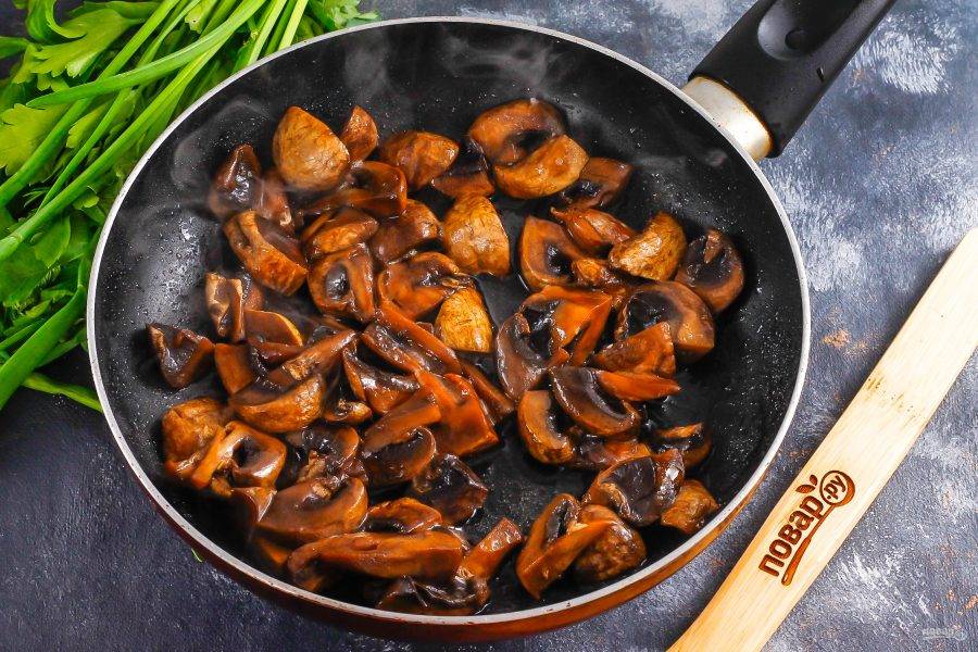Грибы промойте в воде, нарежьте слайсами и обжарьте в растительном масле примерно 5-8 минут, пока не испарится из них жидкость.
