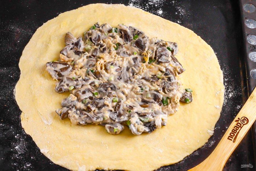Тесто раскатайте в округлый пласт на пергаментной бумаге или на рабочей поверхности и перенесите на противень. Духовку разогрейте до 200 градусов. Выложите на середину теста приготовленную начинку.
