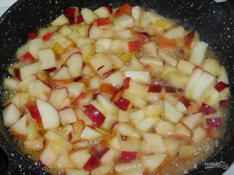 В отдельной сковороде растопите сливочное масло и добавьте сахар. Выложите яблоки, нарезанные кубиками. Тушите все до мягкости сахара и выпаривания лишней жидкости.