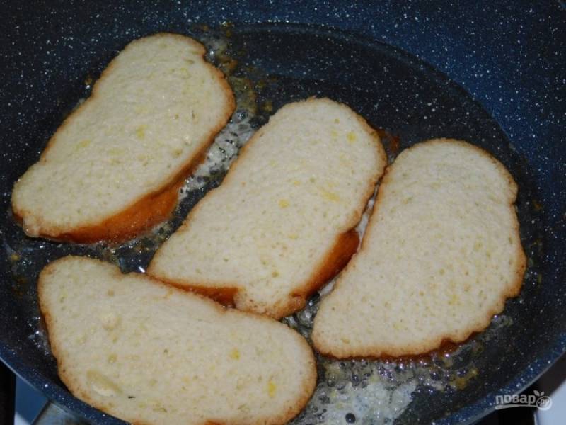 Кусочки батона обмакните в молочной смеси и обжарьте с двух сторон. Выложите на тарелку.