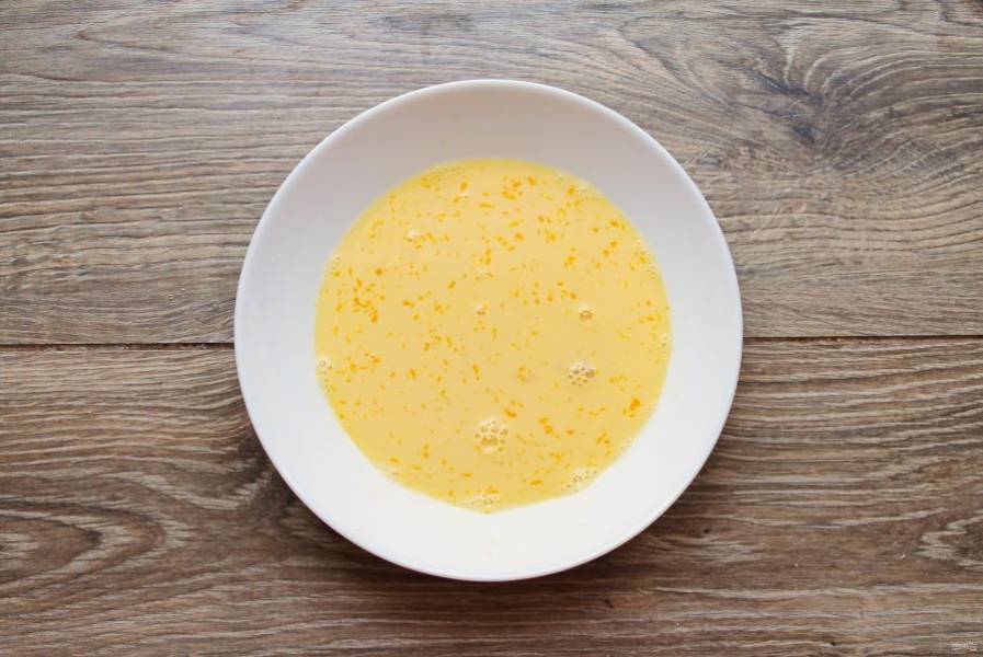 В миску разбейте яйцо, добавьте щепотку соли и влейте молоко. Все хорошо перемешайте до однородности.