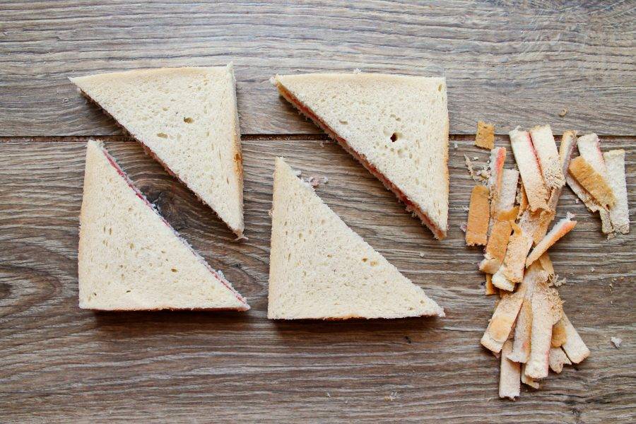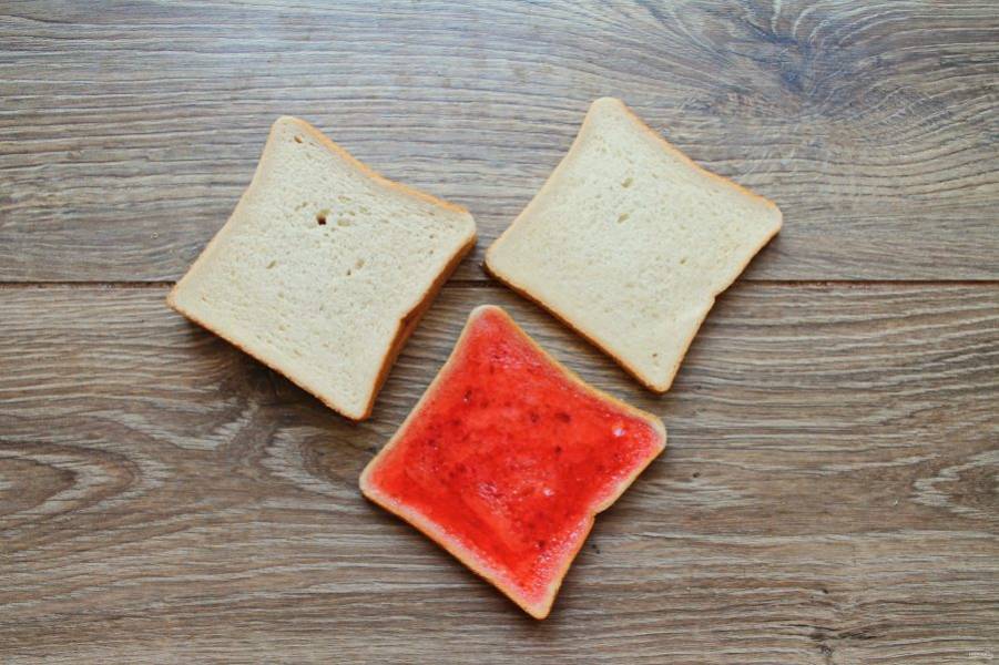 Два куска тостового хлебы смажьте толстым слоем клубничного джема. Дайте немного полежать, чтобы он впитался. Накройте другими кусками хлеба и немного прижмите.