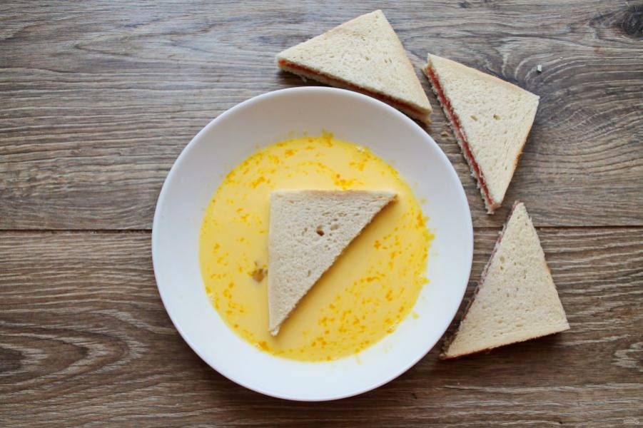 Опустите каждый тост в яичную массу с каждой стороны, чтобы они пропитались.