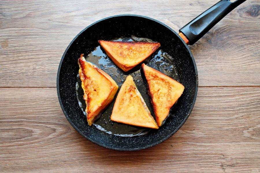 Обжарьте тосты в горячей сковороде с растительным маслом по 2-3 минуты с каждой стороны. Снимите на тарелку и остудите. Перед подачей посыпьте сахарной пудрой.