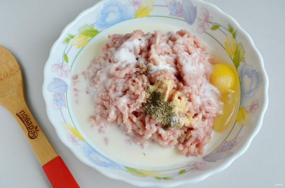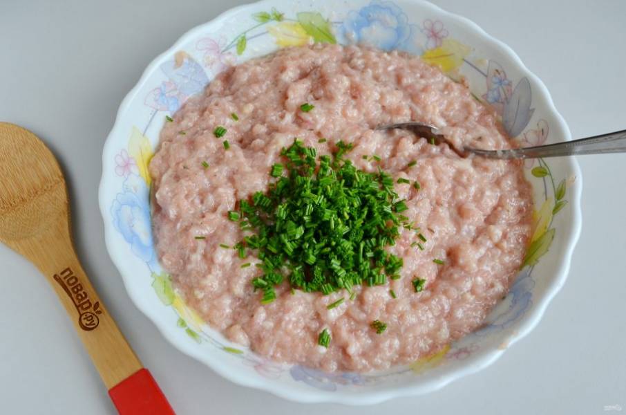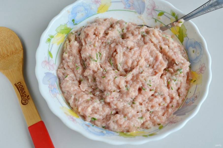 4. Добавьте сливки, бренди, соль, специи, яйцо. Хорошо вымешайте фарш до однородного вязкого состояния.