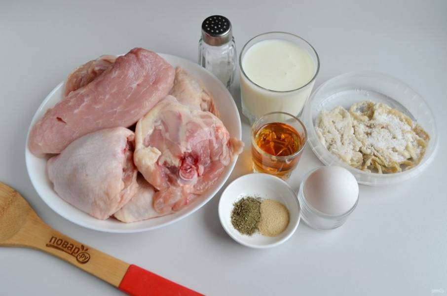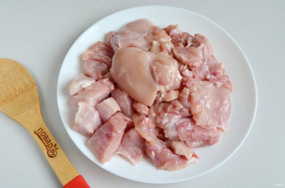 2. Вымойте тщательно все мясо. Свинину порежьте кусочками, с бедрышек снимите кожу и удалите кости.