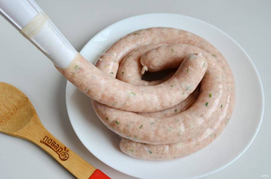 8. Кишку оденьте на специальную насадку, конец хорошо завяжите на "узелок". Наполните кишки фаршем, не допуская попадания воздуха.