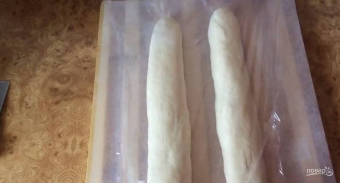 6. Сформируйте батон, прорабатывая каждый шов. Раскатайте батон в багет и выложите на лист бумаги для выпечки. Накройте пищевой пленкой и оставьте на 2-3 часа. Сделайте надсечки на багетах и сбрызните их водой.