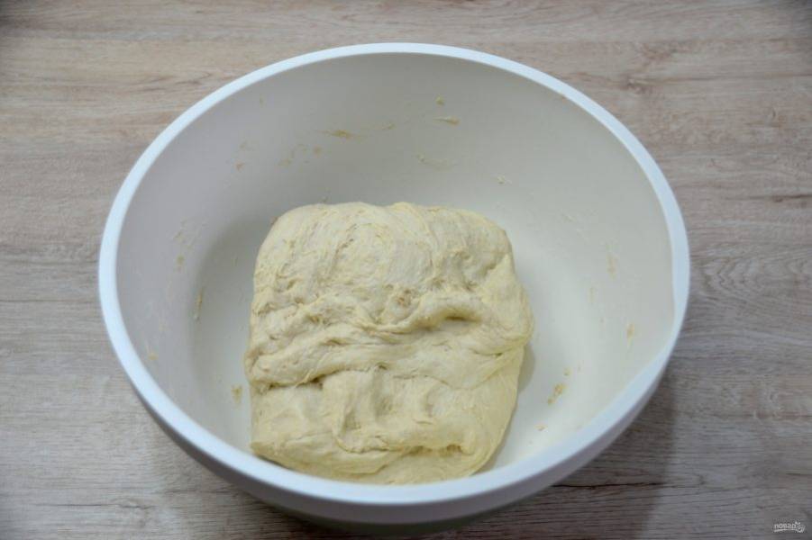 В процессе брожения 2 раза сделайте обминку теста методом "складывания". Оттяните край теста и движением вперед вытяните его на себя.