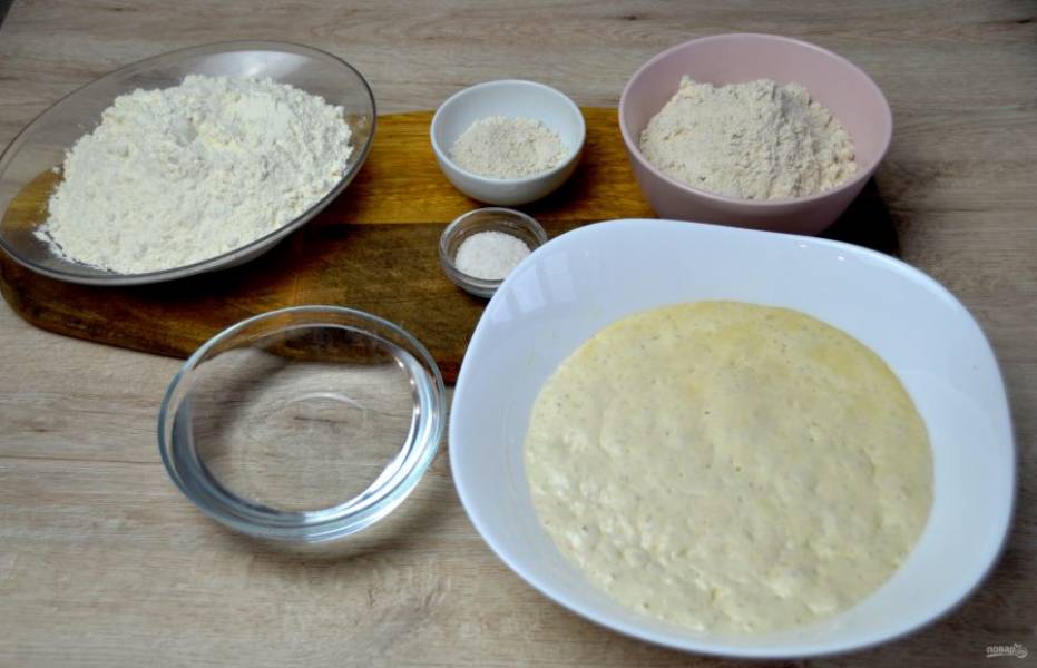 Подготовьте ингредиенты с приготовленной накануне опарой, которую лучше поставить с вечера. О приготовлении опары расскажу в следующих шагах.