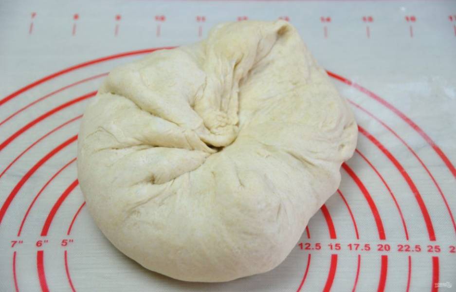 Через 30 минут можно приступить к формовке. Для того, чтобы сформовать круглый хлеб, оттягивайте края теста и складывайте его "в узелок".