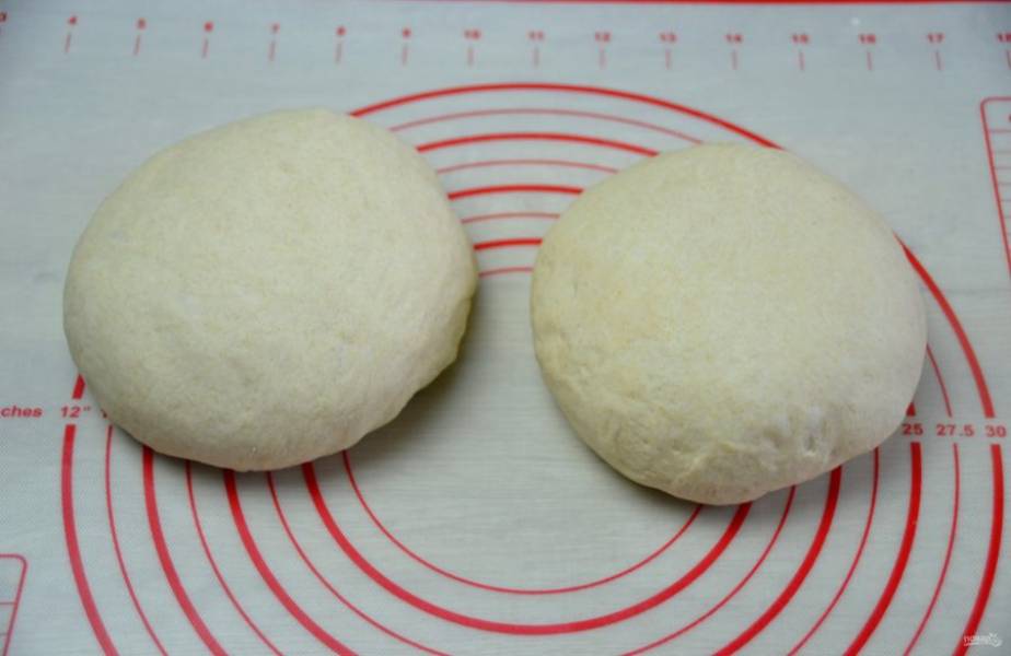 Разделите тесто на две равные части. Округлите в шар, подкатайте, накройте пленкой, оставьте на 30 минут в покое. Этот процесс называется предварительной формовкой хлеба.
