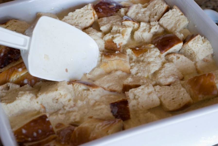 На следующее утро, не снимая фольги, ставим форму в холодную духовку. Включаем температуру 170 градусов и запекаем 30 минут, после чего фольгу снимаем, а пудинг запекаем еще 30 минут при той же температуре.