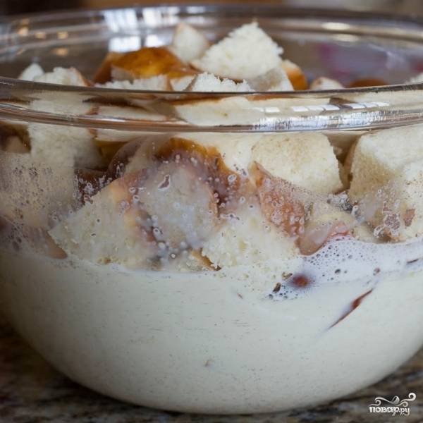 Через пару минут, когда хлеб размокнет, перекладываем все это дело в форму для запекания, смазанную сливочным маслом.