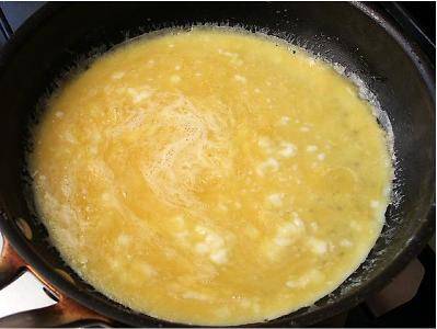 5. Наклоняйте сковороду круговым движением, как будто печете блины, чтобы смесь распределилась равномерно. Когда омлет схватится, поднимите его лопаткой, чтоб жидкая часть смеси затекала под него. Повторите так несколько раз, не забывая покачивать сковородкой.
