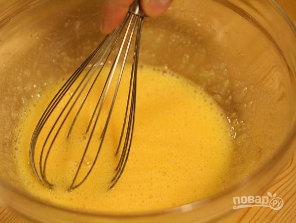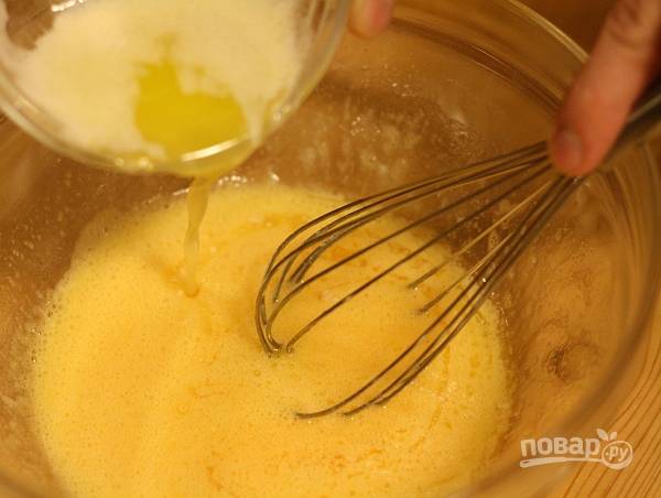 Добавляем ко взбитым яйцам растопленное, но остывшее сливочное масло. Взбиваем до однородности.