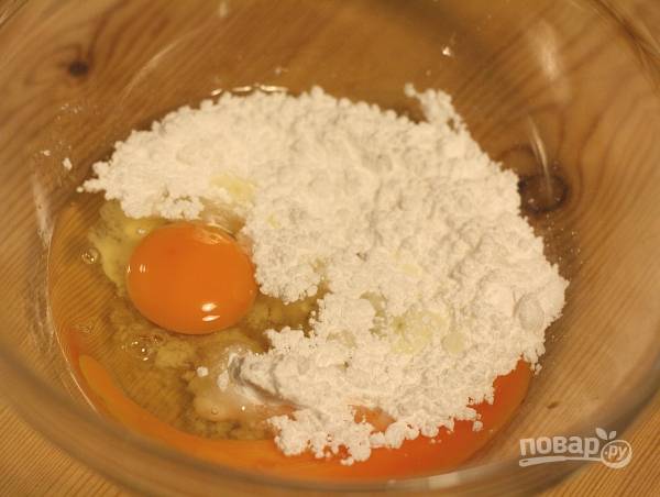 В миску выбиваем яйца и добавляем сахарную пудру с ванилином.
