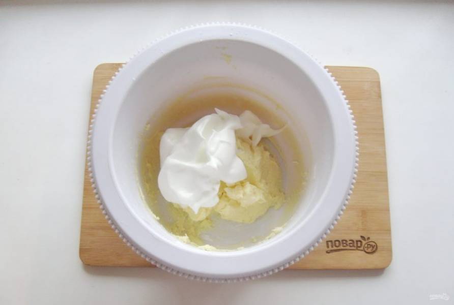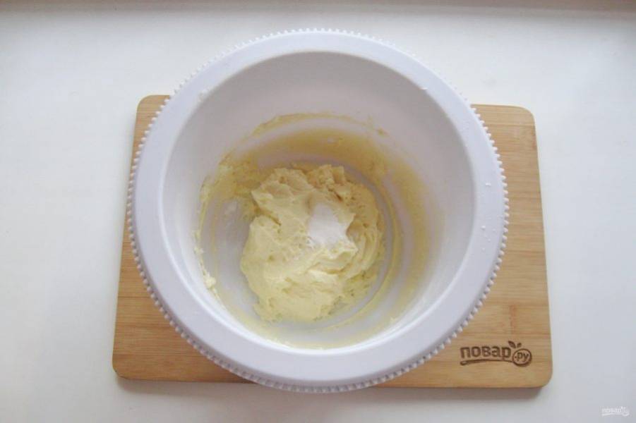 Взбейте миксером масло с сахарной пудрой, добавьте пару щепоток разрыхлителя.