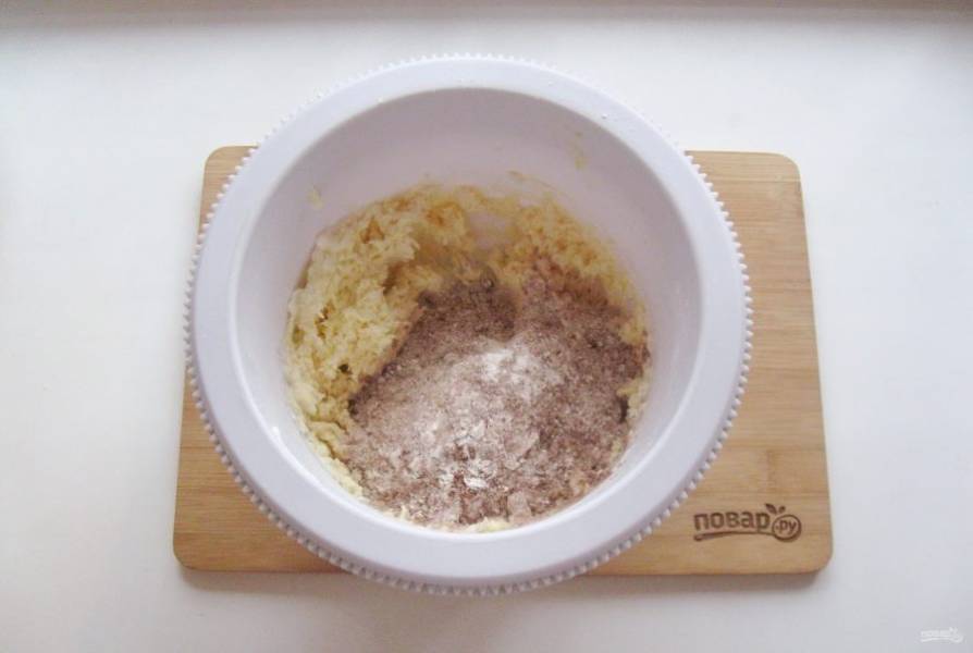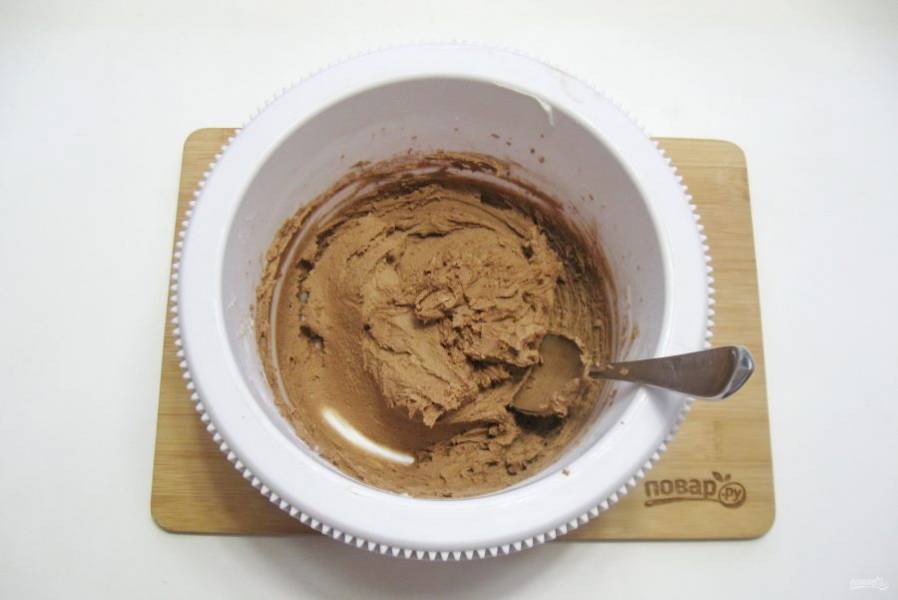 Постепенно добавьте в тесто смесь какао и муки.