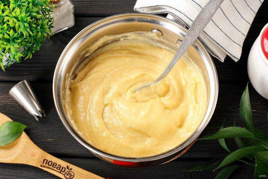 Французское заварное тесто готово. Переложите его в кондитерский мешок со специальной насадкой или просто отсадите изделия при помощи чайной ложки. Удачной вам выпечки!