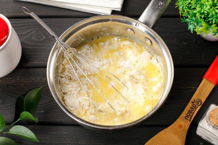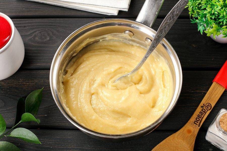 Остудите тесто до 35-40 градусов. Если у вас нет пищевого термометра, то просто потрогайте тесто рукой, оно не должно вас обжигать, а быть приятной температуры. До полного остывания его тоже не доводите, оно загустеет и работать с ним станет сложнее. Теперь начните вводить яйца.