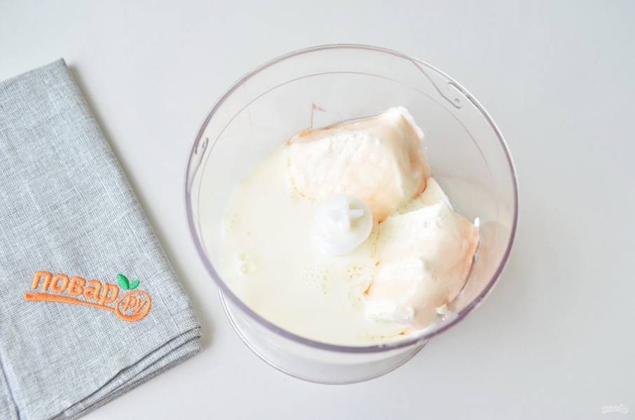 2. В чашу блендера положите мороженое, добавьте к нему молоко и сироп.