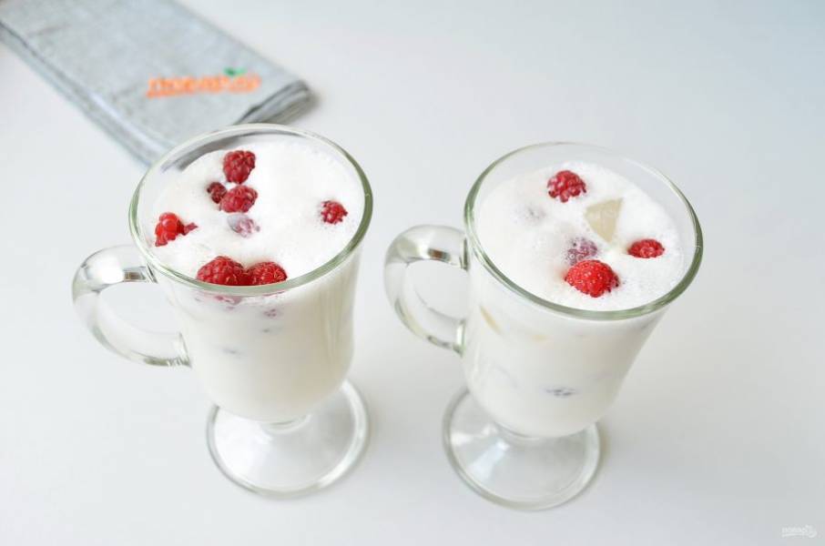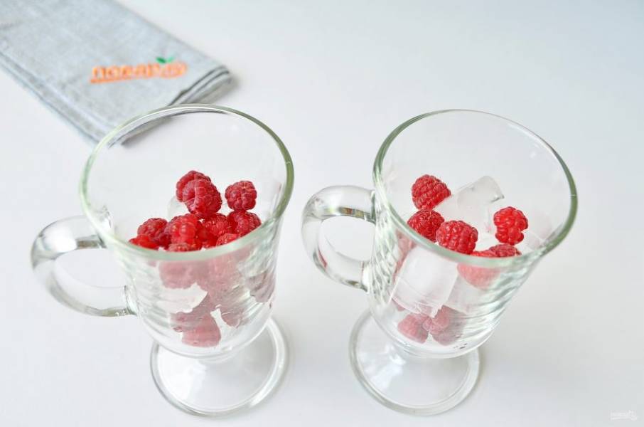4. В высокие бокалы или стаканы положите лед и малину, чередуя.