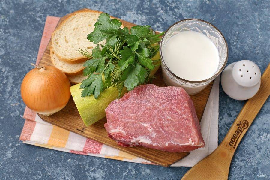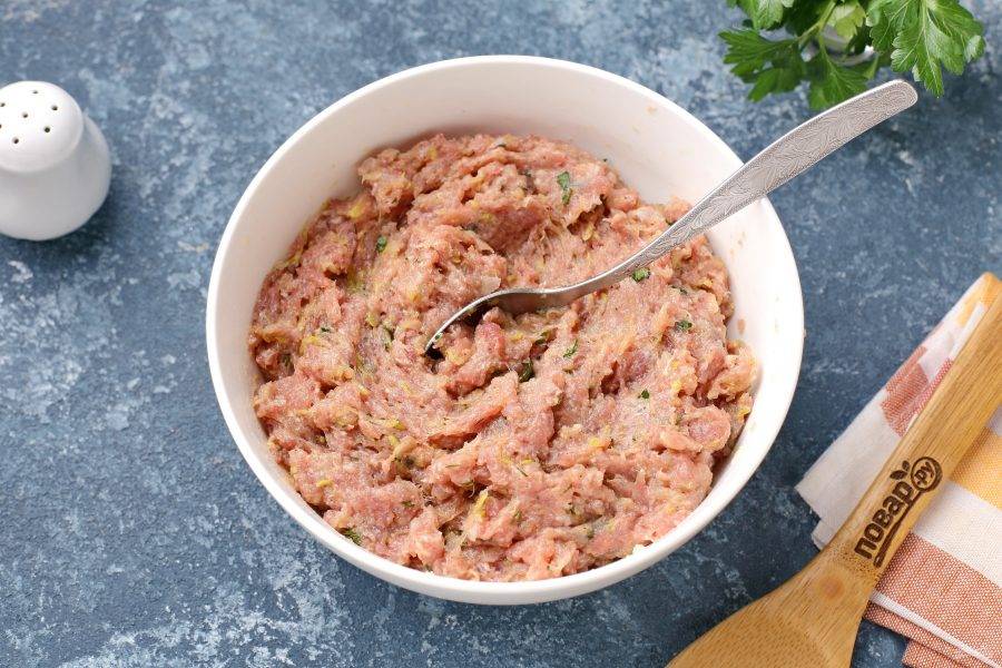 Лук и отжатый батон пропустите через мясорубку и добавьте к фаршу. Сюда же добавьте отжатый кабачок, измельчённую зелень (по желанию) и соль по вкусу.
