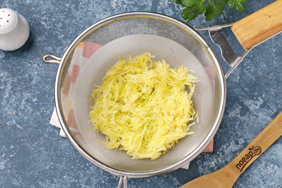 Кабачок натрите на мелкой тёрке, добавьте щепотку соли и перемешайте. Оставьте на 10 минут, после чего хорошо отожмите.