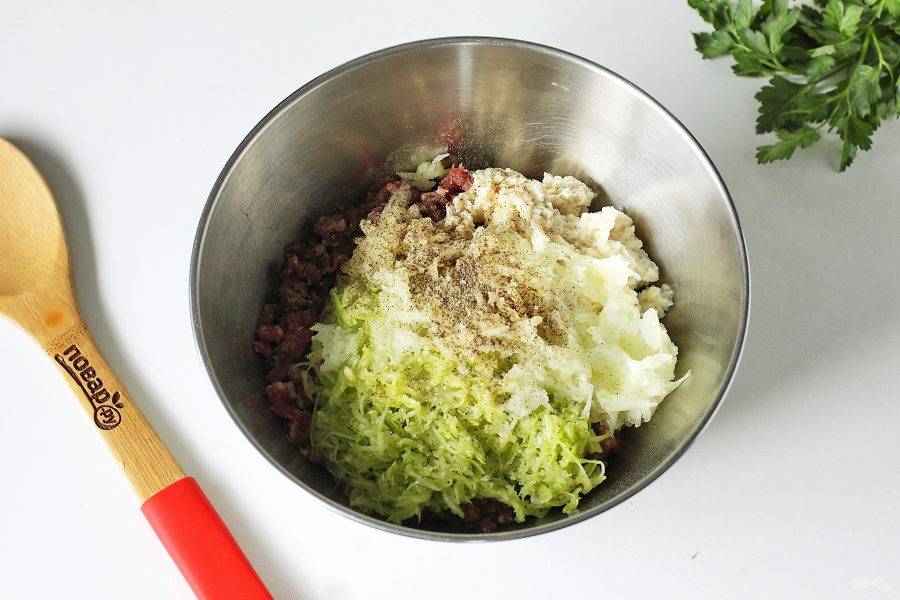 В глубокой миске соедините фарш, отжатый батон, кабачок и тертый на крупной терке лук. Добавьте соль по вкусу и любимые специи.