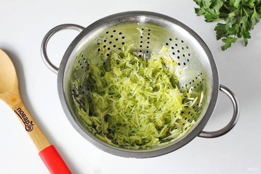 Кабачок натрите на мелкой терке и хорошо отожмите.