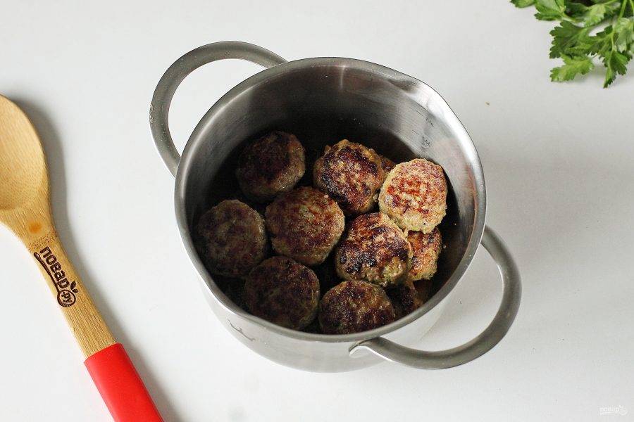 Обжарьте фрикадельки на сильном огне с двух сторон до румяной корочки.