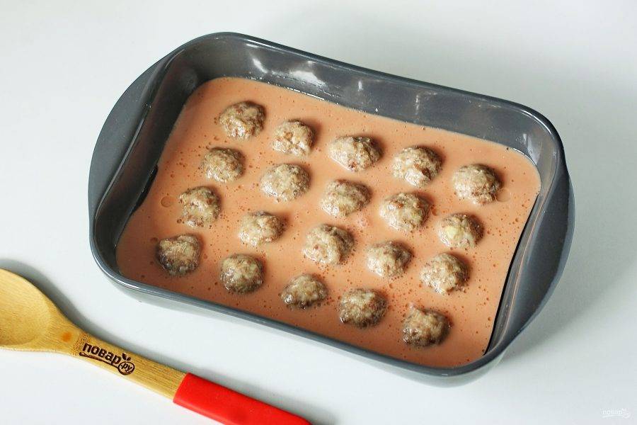 Сформируйте из фарша фрикадельки и переложите их в смазанную маслом форму для запекания.