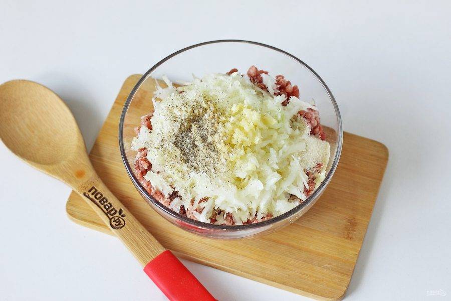 Добавьте тертый на крупной терке лук, соль и специи по вкусу.