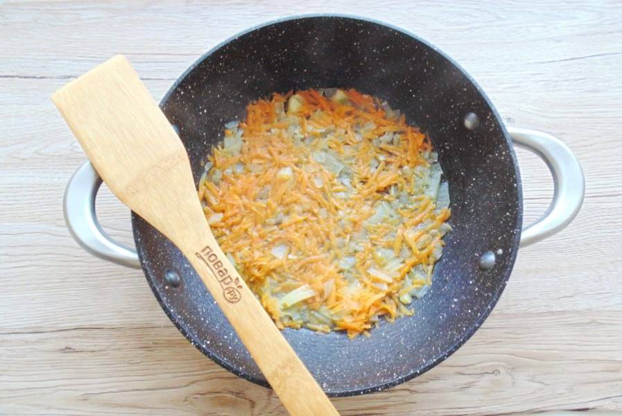 Одну луковицу и морковку очистите и промойте. Лук мелко нарежьте, а морковь натрите на терке. Выложите в сотейник или в глубокую сковороду.