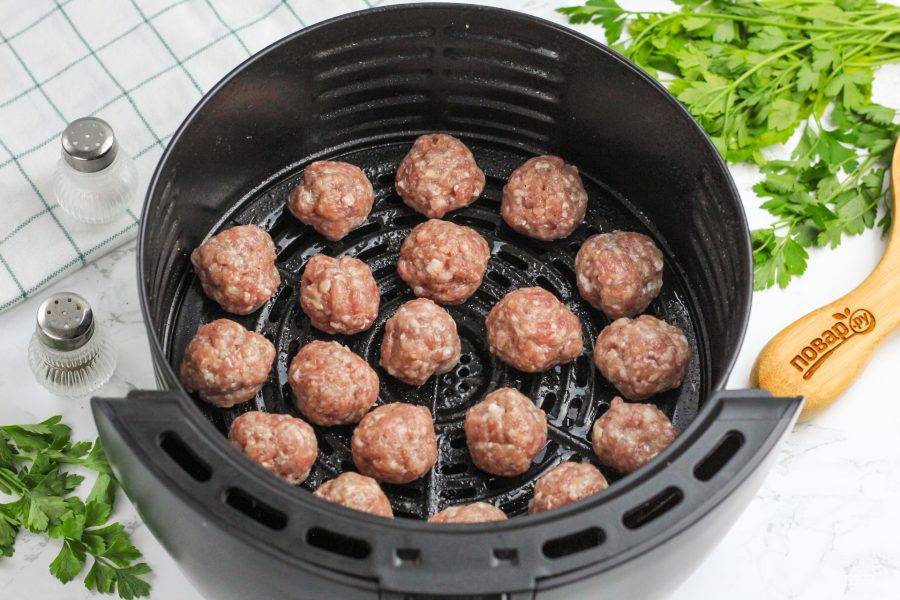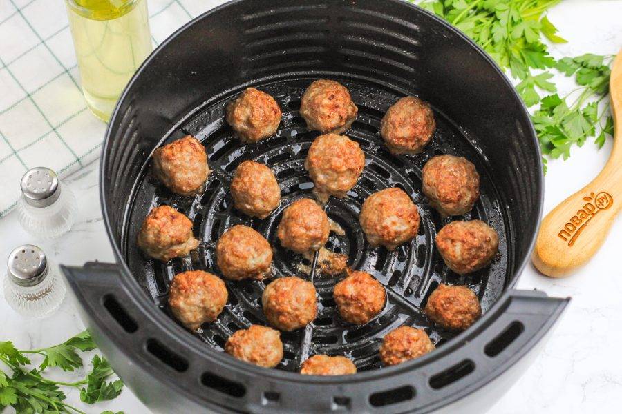Замечательный вариант мясного блюда из фарша можно приготовить в аэрогриле. Фрикадельки получатся сочными и румяными. Подавайте их с любым гарниром, салатом из свежих овощей, соусами или хлебом.