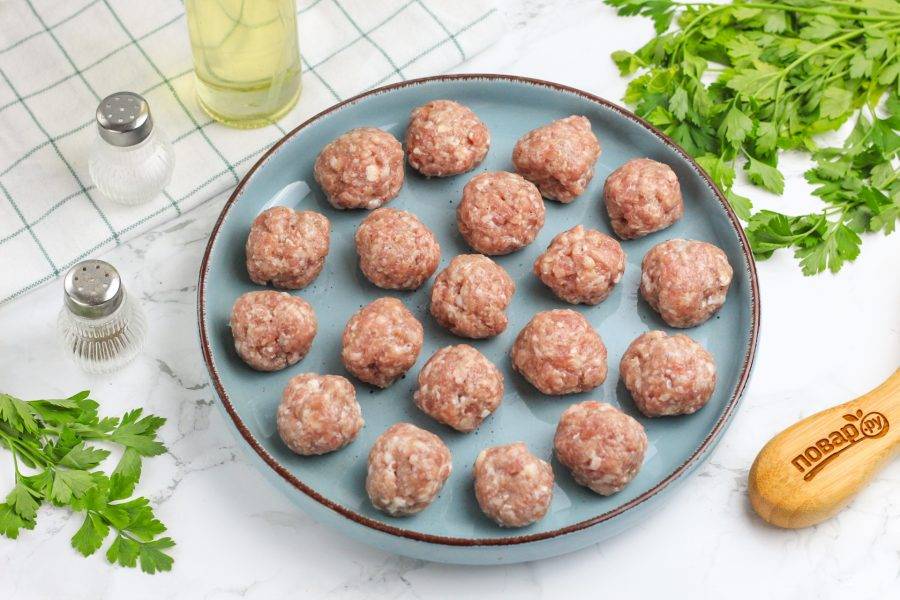 Смочите руки в воде и сформируйте из фарша округлые небольшие колобочки одинакового размера.