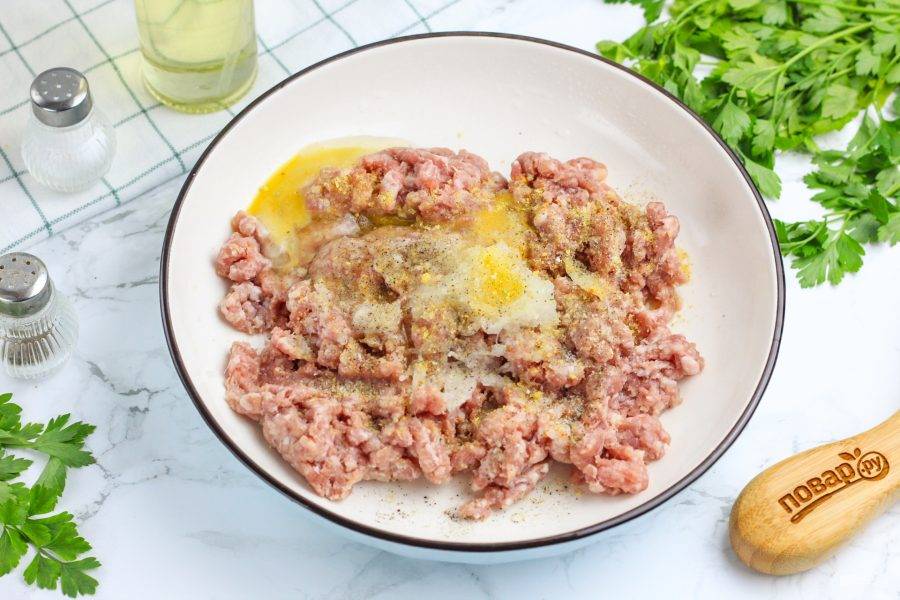Всыпьте соль и молотый перец, добавьте приправу. Допустимо заменить приправу на другие специи или пряности, но не крупного помола. Тщательно вымешайте весь фарш.
