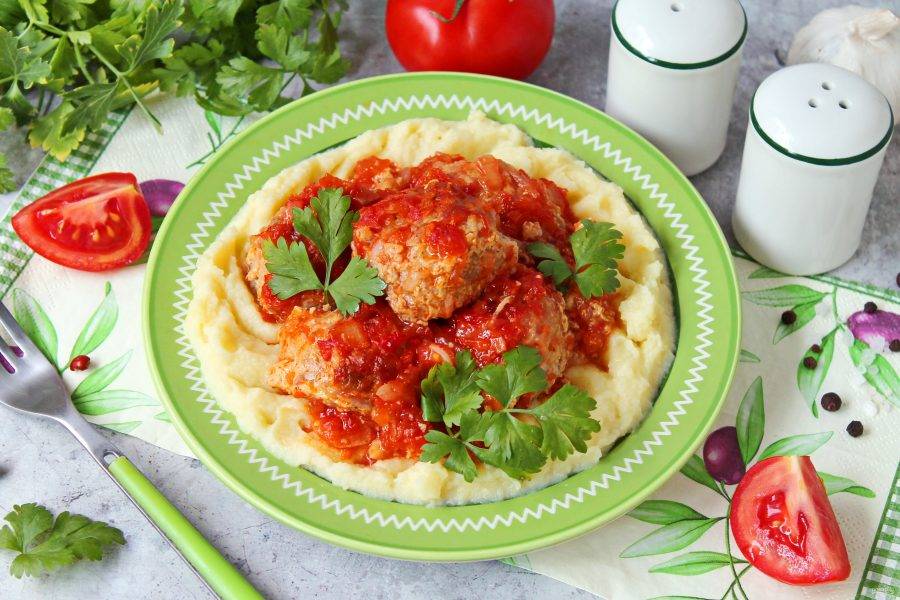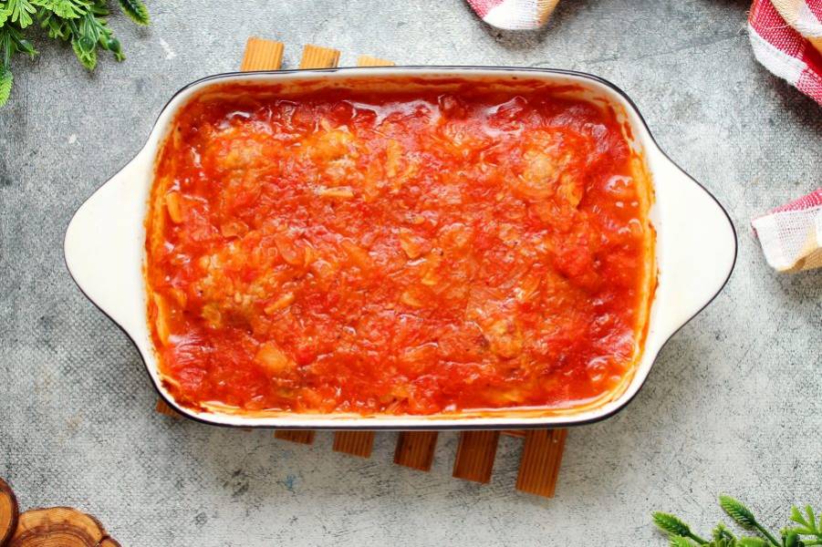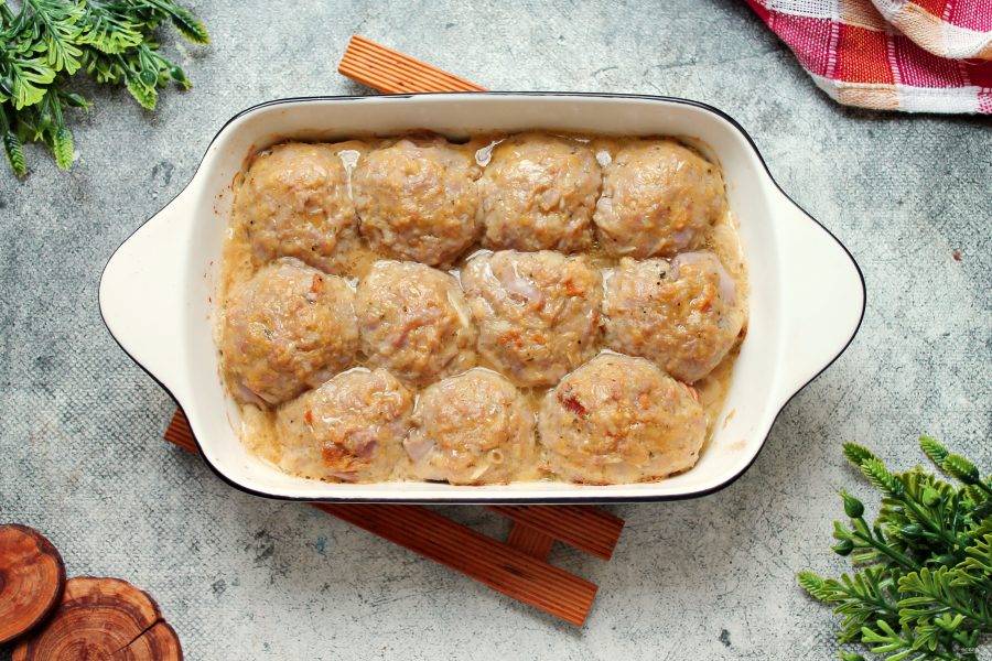 Залейте фрикадельки соусом и поставьте обратно в духовку. Запекайте еще в течение 10-15 минут. Затем достаньте готовые фрикадельки из духовки и подавайте к столу.