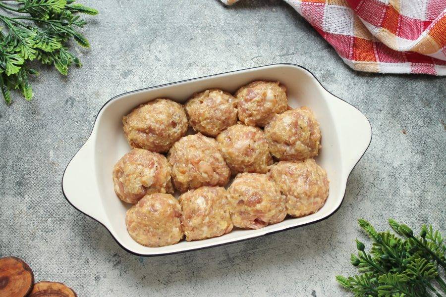 Форму для запекания смажьте растительным маслом. Фарш разделите на одинаковые части и сформируйте фрикадельки. Поставьте в горячую духовку и запекайте в течение 15 минут при температуре 180 градусов.