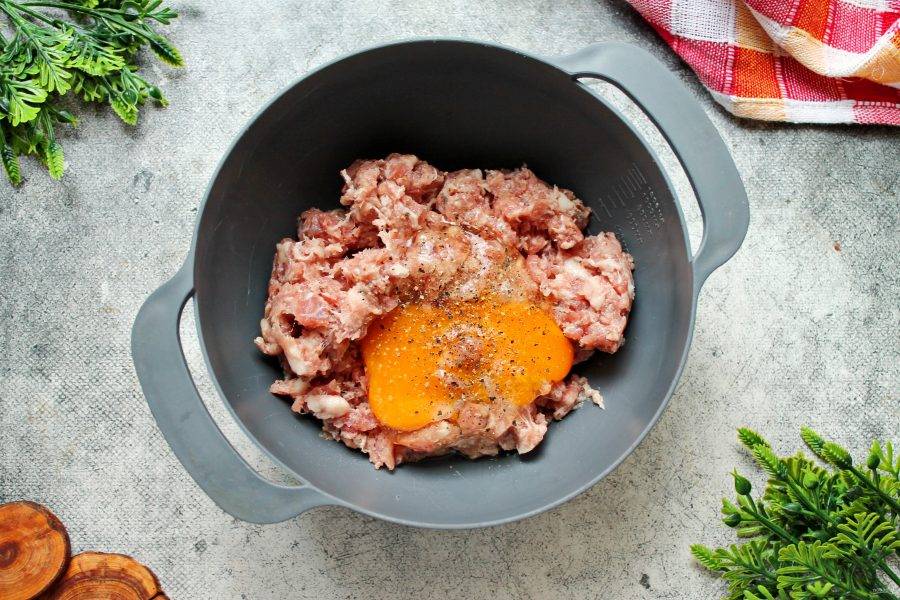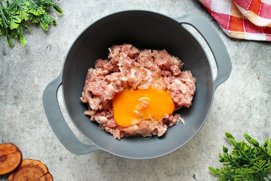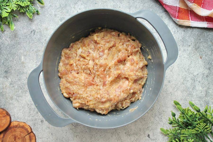 Все хорошо перемешайте и отбейте, чтобы мясной фарш стал плотным. Для этого соберите фарш в руку, поднимайте и бросайте обратно. Сделать так надо 10-15 раз до нужной консистенции.