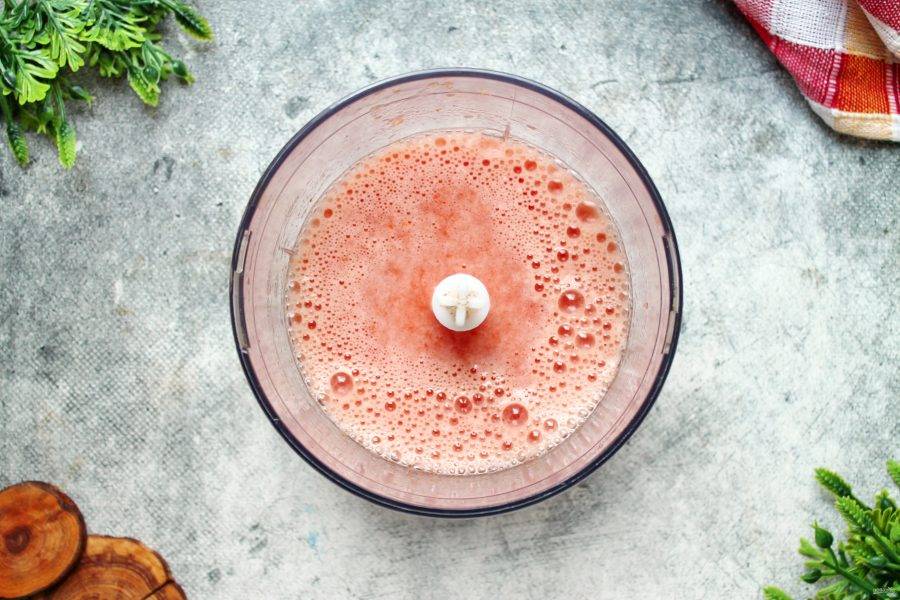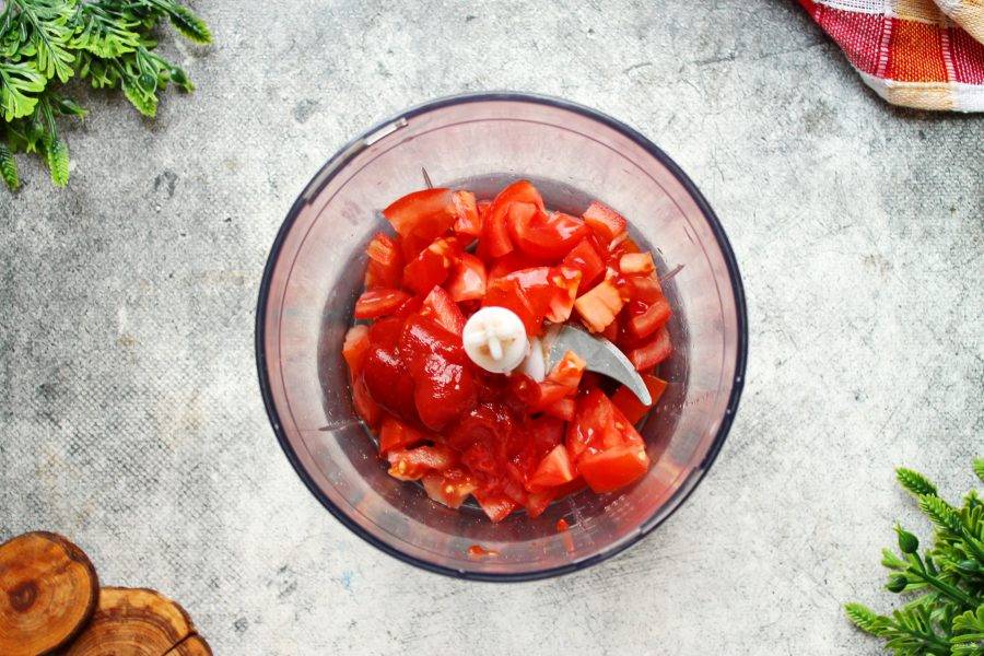 Добавьте к помидорам кетчуп и влейте воду. Пробейте все в блендере до однородности.