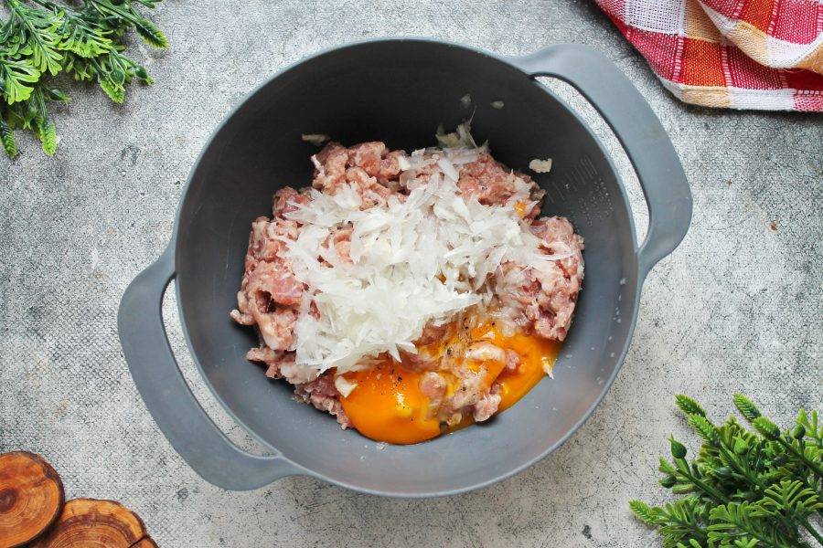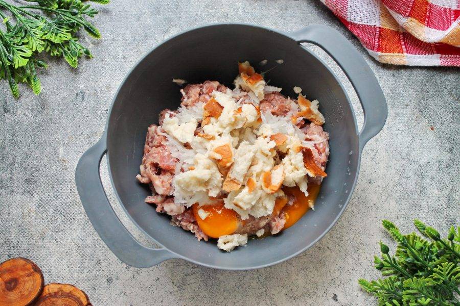 Репчатый лук и чеснок измельчите и добавьте к фаршу с булкой. Это можно сделать при помощи блендера или просто натереть на крупной терке.